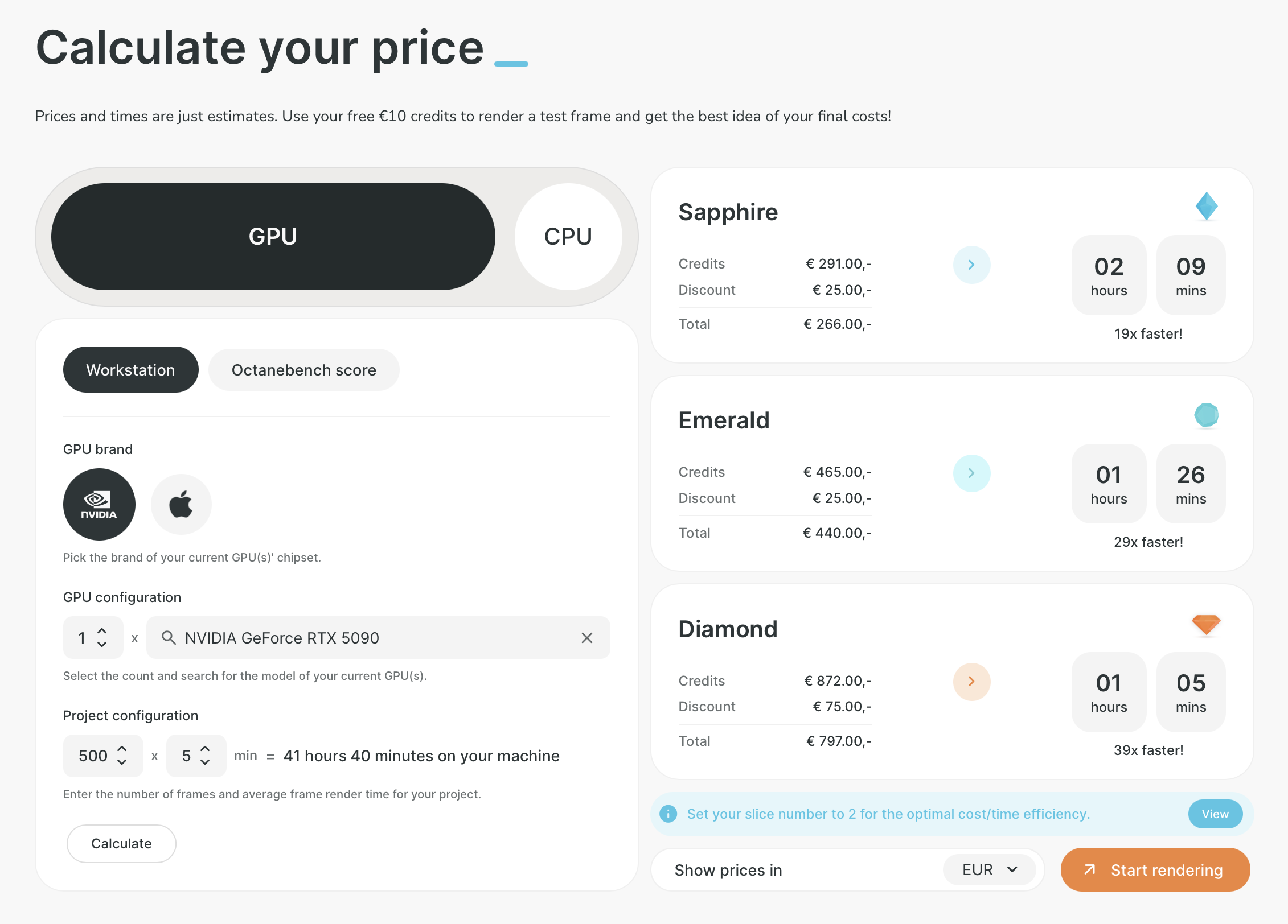 Costs vary by renderer, frame count, and render time. For a 500-frame GPU job at 5 min/frame, prices ranged from ~$216 (Garage Farm) to ~€486 (Rebus Farm) in our test. Most farms offer calculators and free credits for testing.